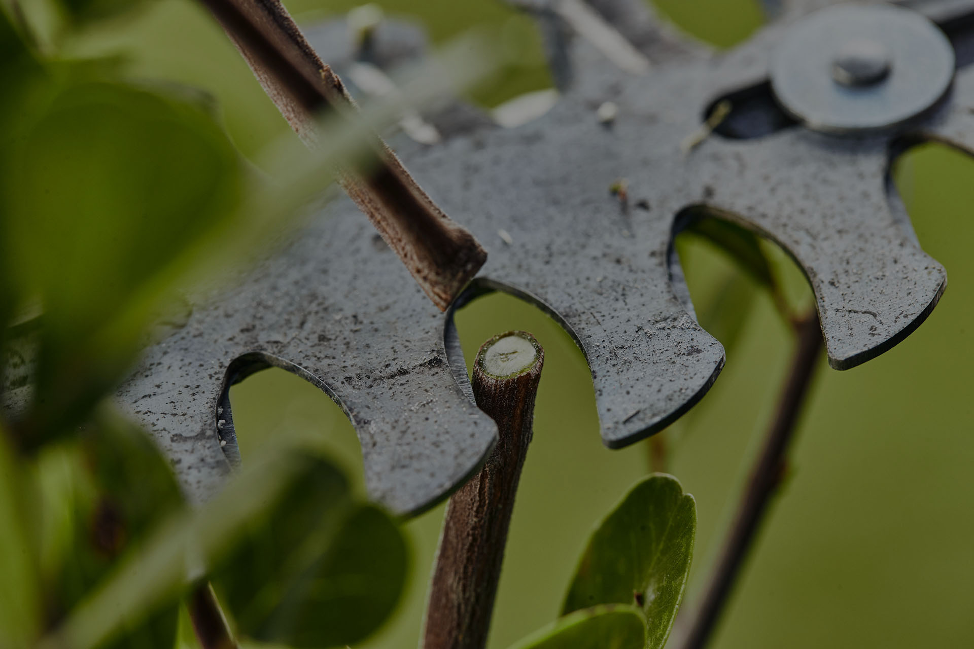 Nahaufnahme: Klinge einer Heckenschere schneidet einen Stängel