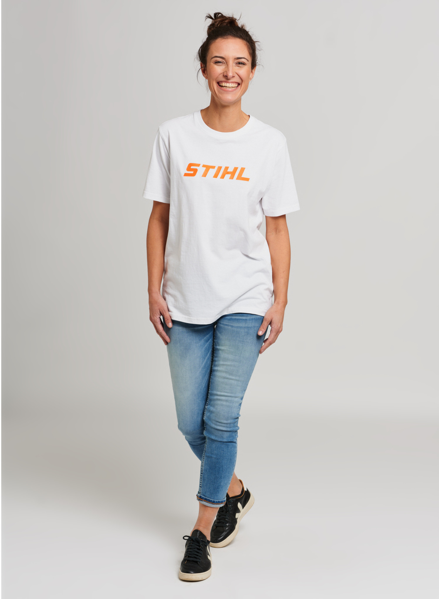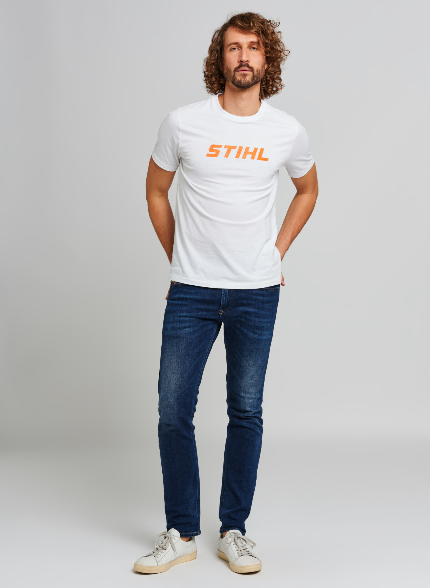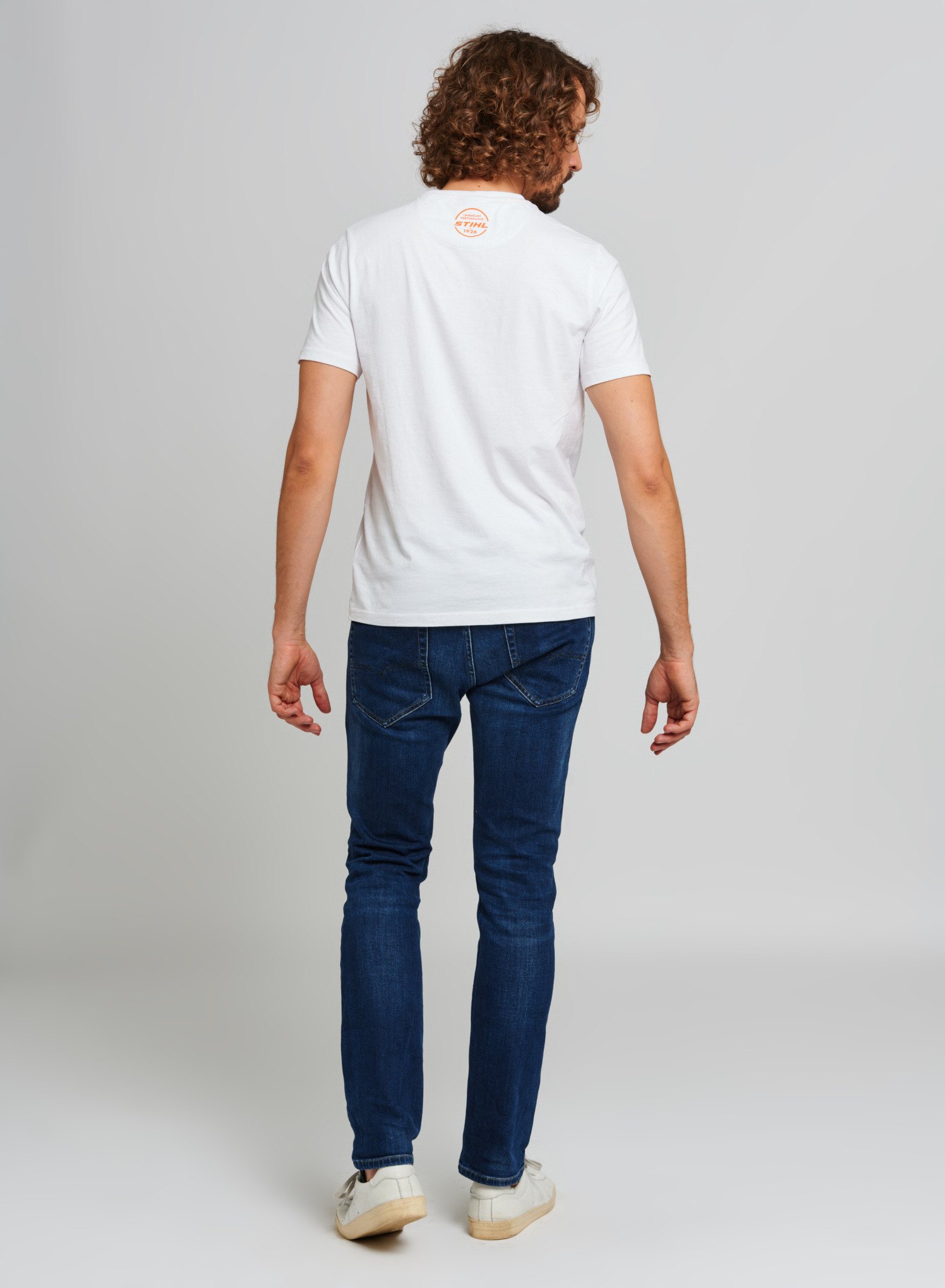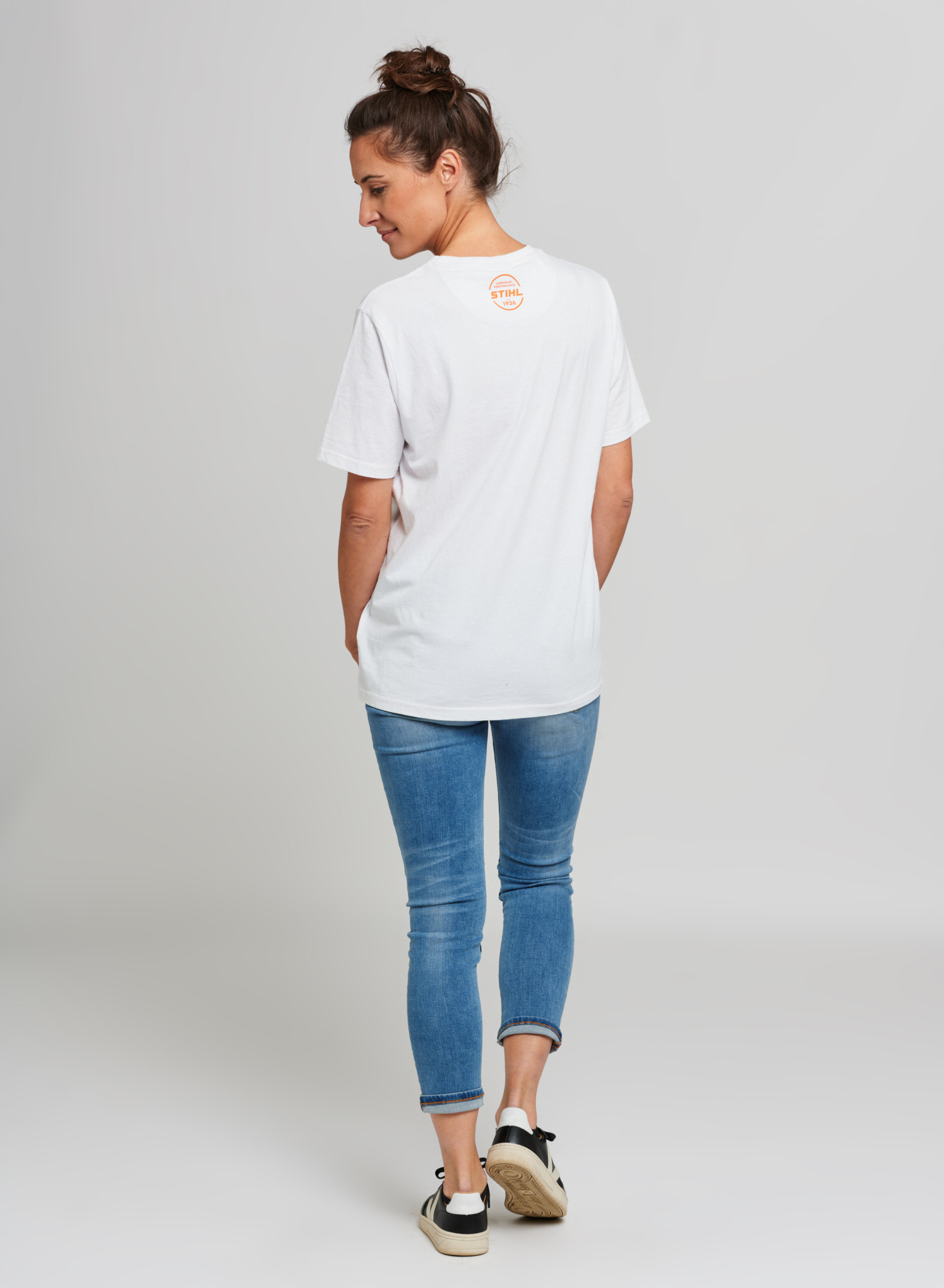 T-shirt blanc à col rond en jersey de coton de qualité supérieure, avec large logo imprimé dans la couleur orange contrastée. Étiquette logo STIHL à l'intérieur, un autre logo orange à l'extérieur au dos.