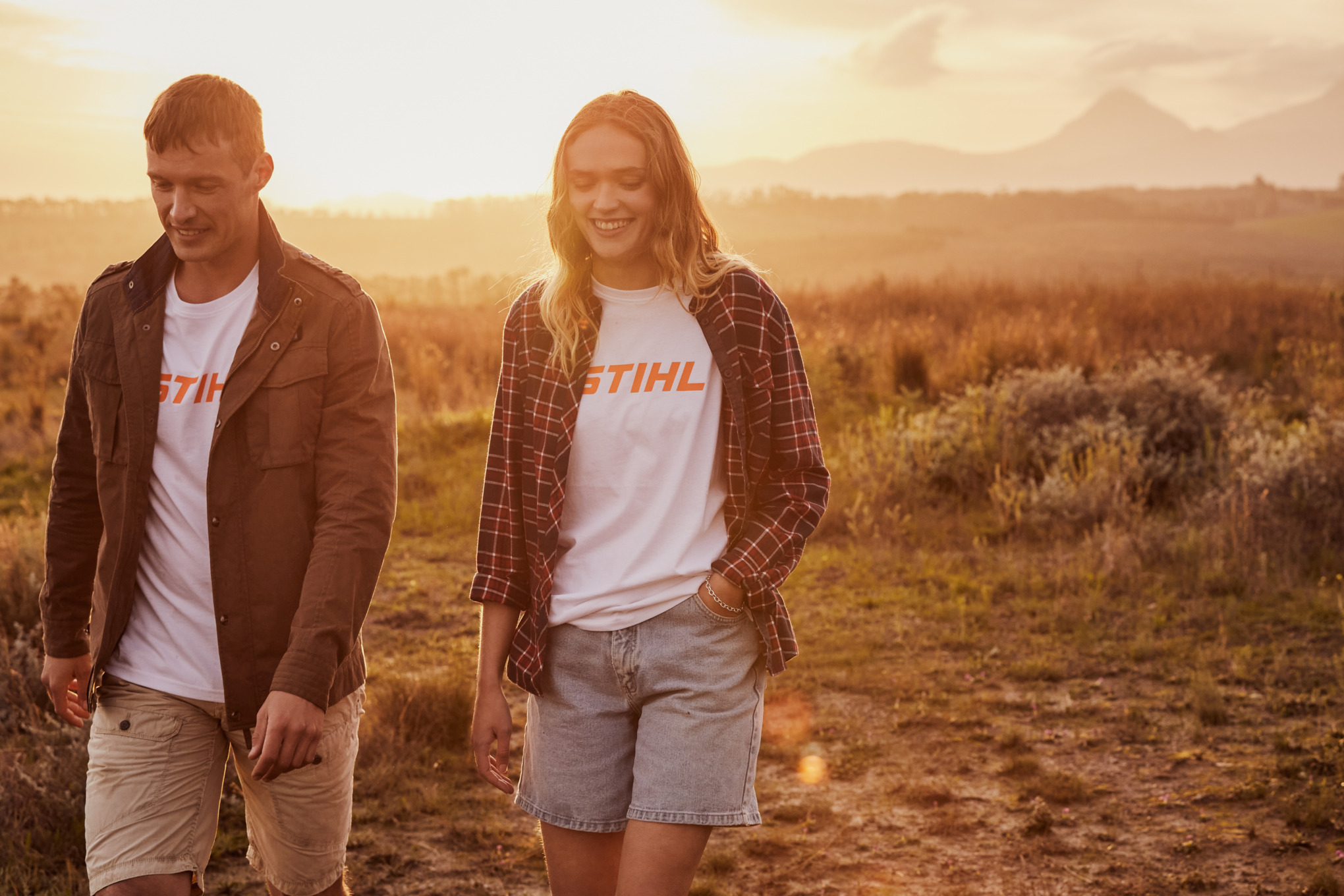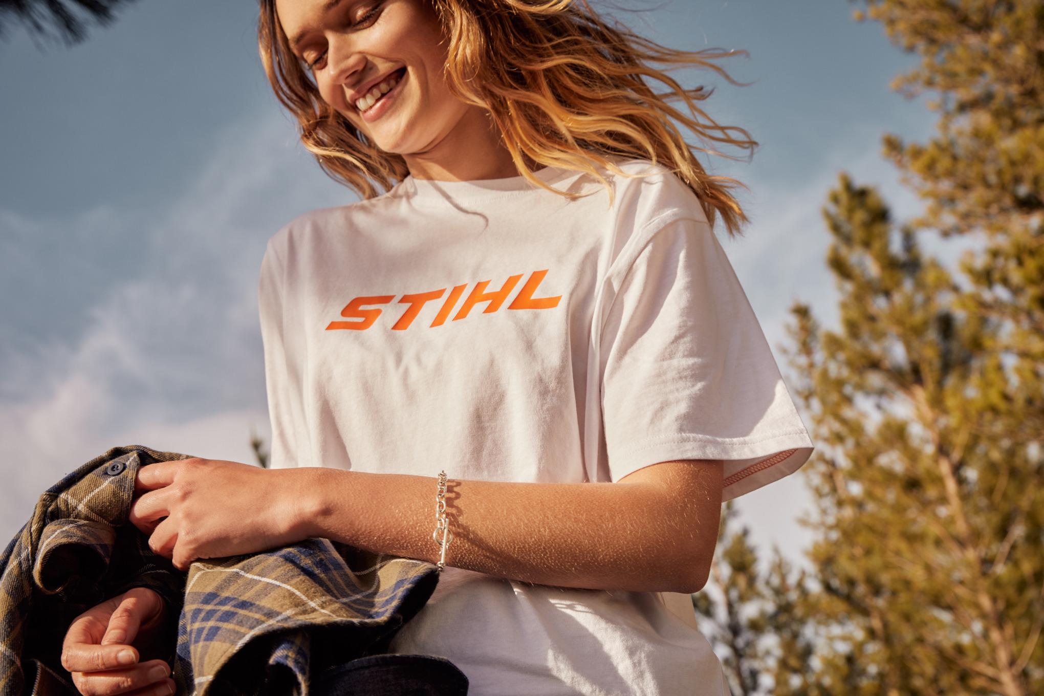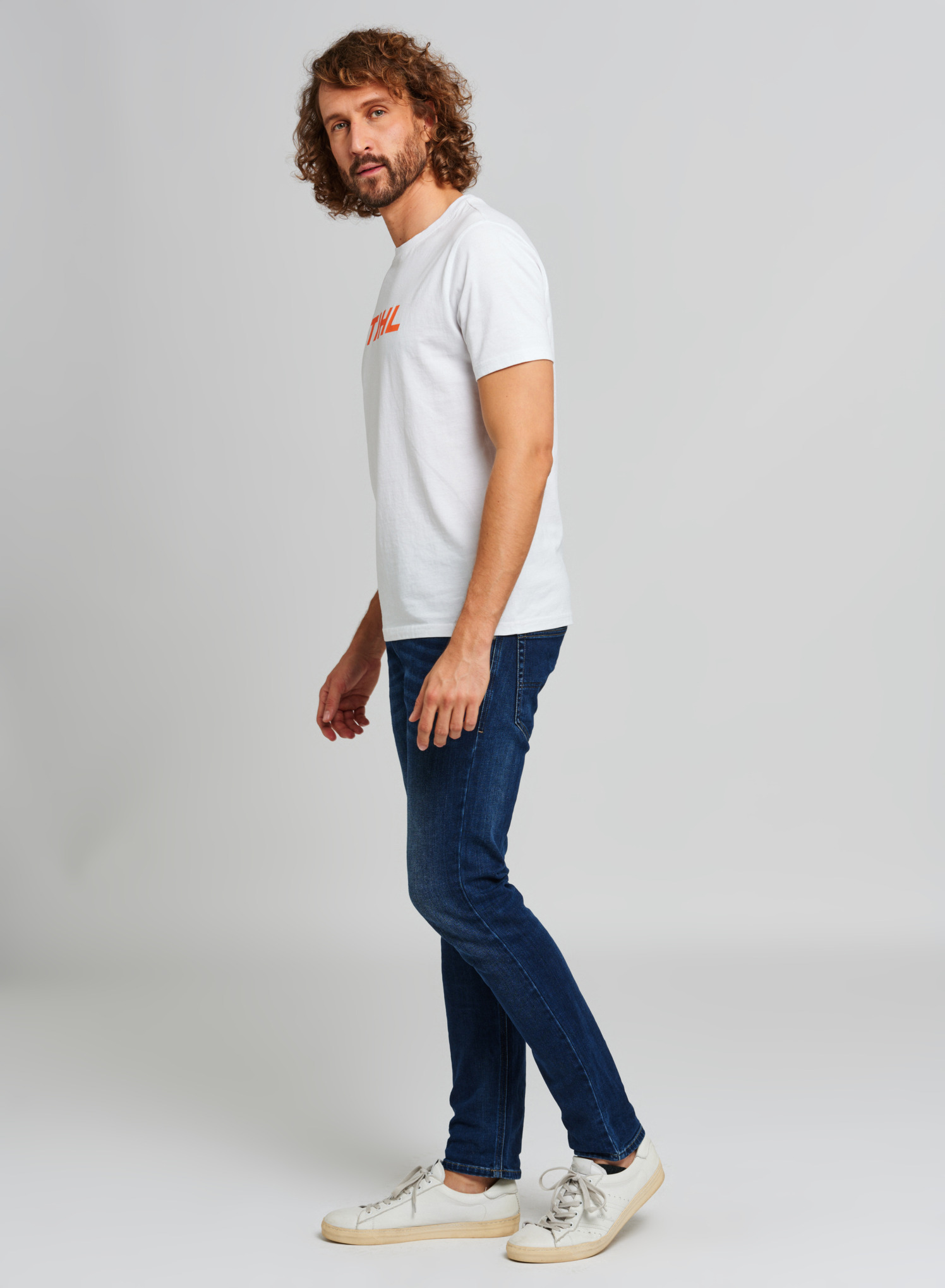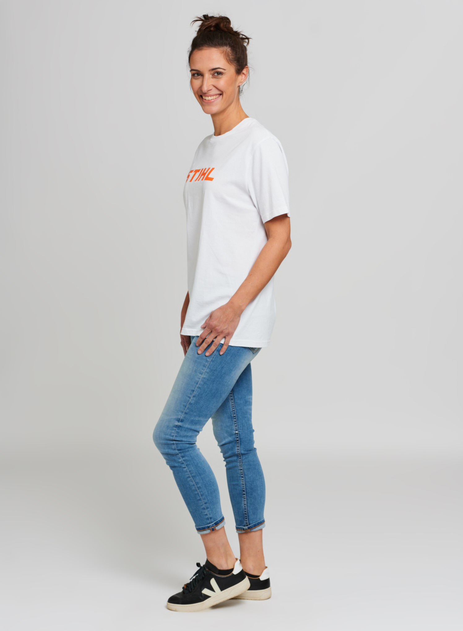 T-shirt blanc à col rond en jersey de coton de qualité supérieure, avec large logo imprimé dans la couleur orange contrastée. Étiquette logo STIHL à l'intérieur, un autre logo orange à l'extérieur au dos.
